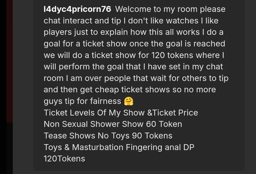 Welcome to my room please chat interact and tip I don't like watches I like players just to explain how this all works I do a goal for a ticket show once the goal is reached we will do a ticket show where I will perform the goal that I have set in my chat room I am over people that wait for others to tip and then get cheap ticket shows so no more guys tip for fairness ๐ค
